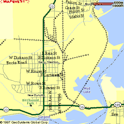 This major Missabe yard can be viewed at the south end from the Second Street grade crossing. Many of the original backshop buildings still stand, and now house the Engineering department and vehicle maintenance shops. Exit Highway 2 at East Railroad Avenue, and you can follow the yard to the north end. The diesel shop and roundhouse are viewable from the road (do not cross tracks). Return to Highway 2 and exit left at St. Louis River Road, and a bridge takes you over the Missabe tracks, with a great view of the North End of Proctor Yard.