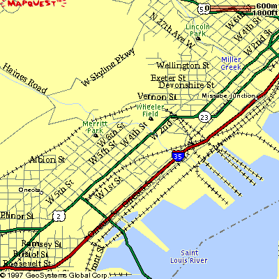 The seven-mile run down the hillside from Proctor to the Duluth docks on a 2.2 percent grade loosely parallels Interstate 35. At the Boundary Avenue exit, the service roads south of the freeway allow good viewing of trains beginning or ending the long descent. At the Highway 2 exit, you can climb the hillside and watch trains running alongside the freeway.